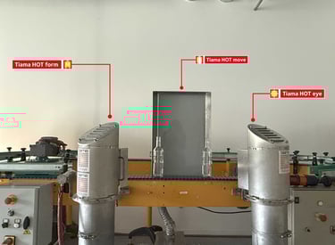 Stickers nominaux pour les machines Tiama HOT : Tiama HOT Form, Tiama HOT Move et Tiama HOT Eye, dédiées à l’inspection du verre.