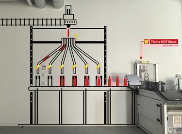 Stickers illustrant l’ensemble du processus de production du verre (moulage, …) et la machine Tiama HOT Blank, située à la suite de cette chaîne de production.