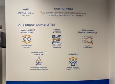 Fresque murale mettant en avant la mission, les capacités du groupe et les six marques Kestrel Vision.