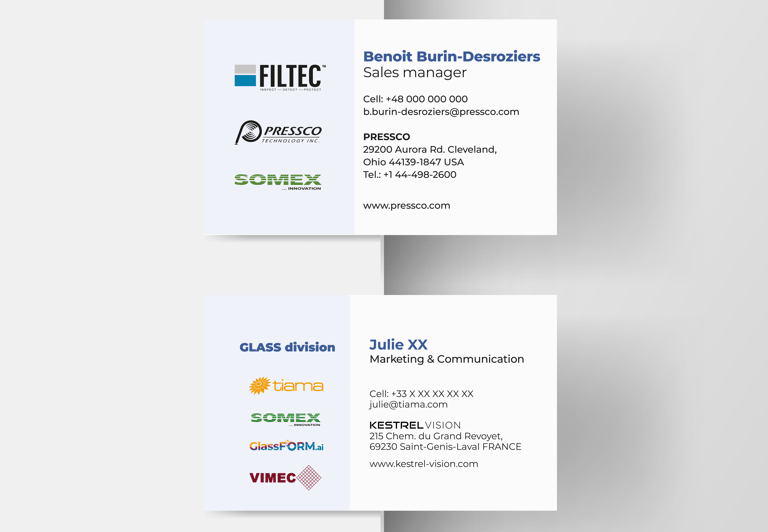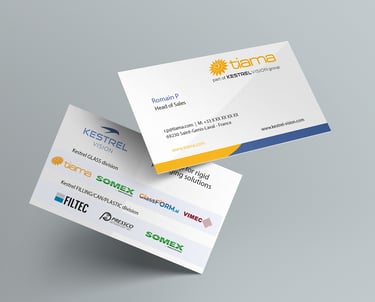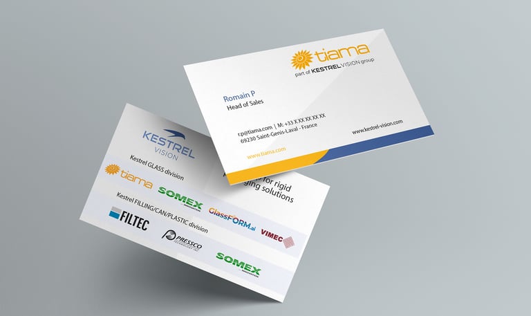 Recto respectant la charte graphique Tiama (couleurs, typographie et informations collaborateur) ; verso présentant le portefeuille des marques du groupe Kestrel Vision et leurs divisions (Glass et Filling Can Plastic).