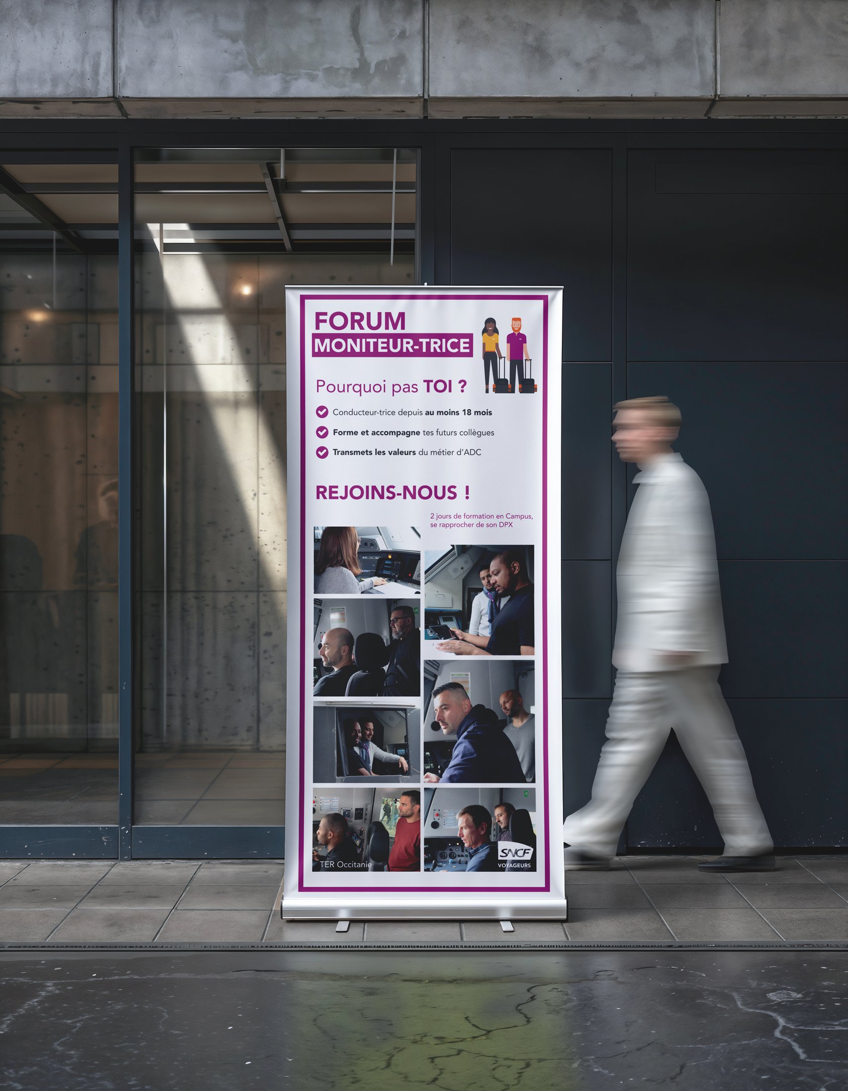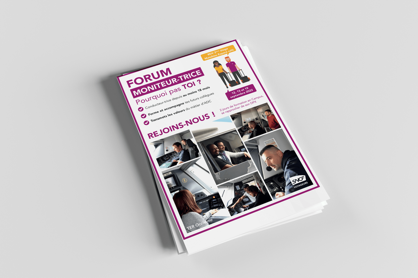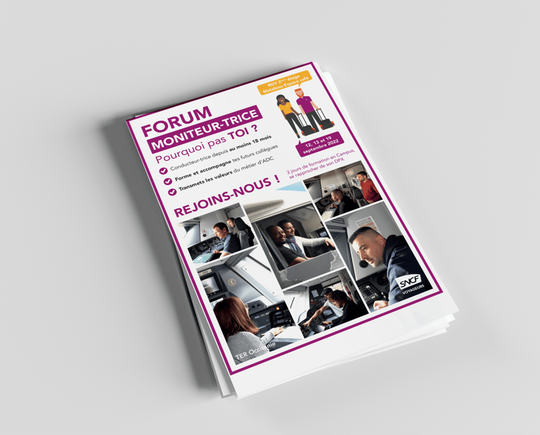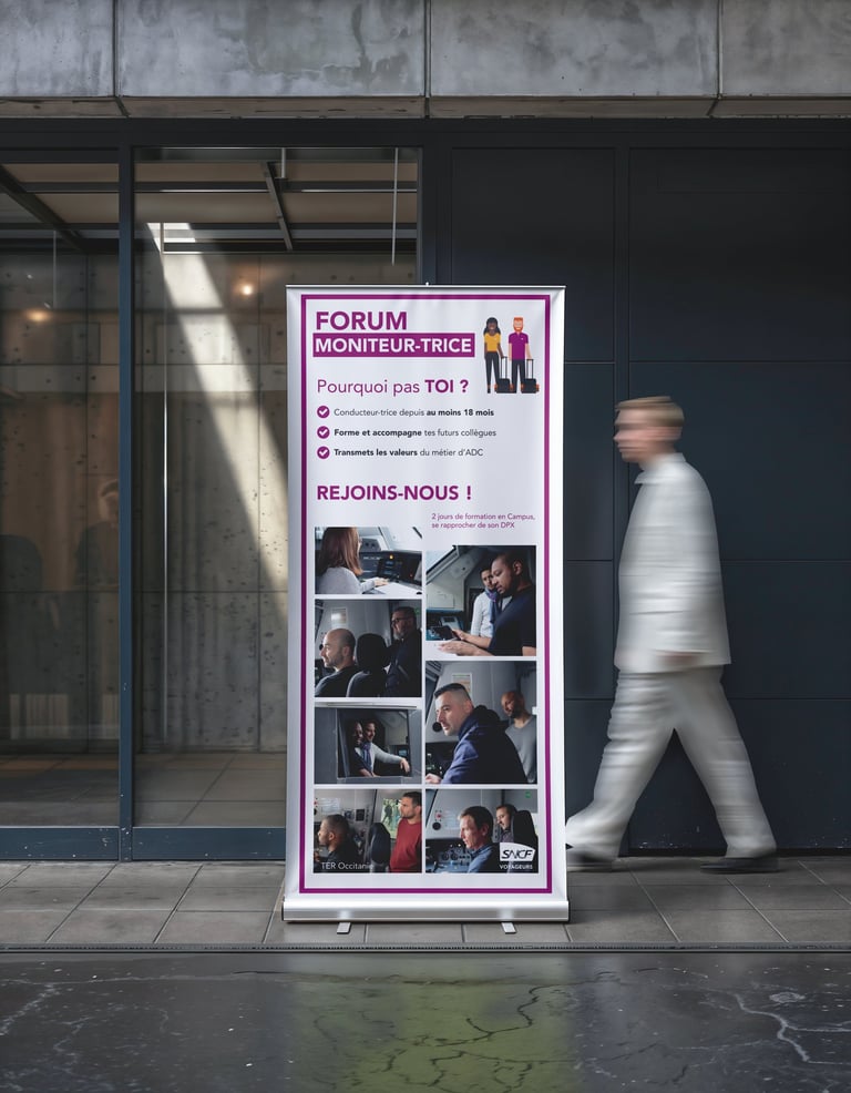 Création des supports du Forum Moniteur-trice SNCF TER Occitanie, direction des lignes Occitanie Nord-Ouest (photos, kakemonos, flyer), avec des prises de vue des conducteurs formateurs en train de former, pour mettre en valeur leur rôle et encourager les agents à former les futurs conducteurs.